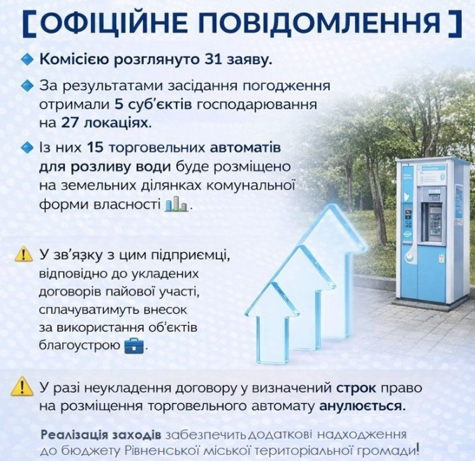 Департамент економічного розвитку Рівненської міської ради повідомляє, що на виконання Положення про організацію дрібнороздрібної торгівлі та проведення ярмарків на території Рівненської міської територіальної громади, затвердженого рішенням виконавчого комітету від 13.05.2025 № 75, 26 січня 2026 року відбулося засідання Комісії з визначення місць розміщення пересувних об’єктів торгівлі, зокрема торговельних автоматів (вендінгів) для торгівлі водою 💧.